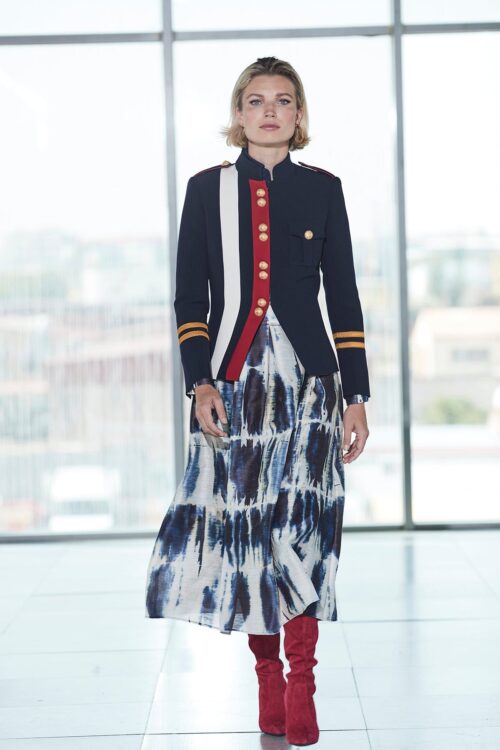 The design features high-quality gold buttons that run along the front and decorate the cuffs, adding a touch of distinction and exclusivity. The decorative epaulettes on the shoulders, adorned with gold details, reinforce its martial inspiration, while the cuffs feature two gold-embroidered lines that elevate the design with a handcrafted detail